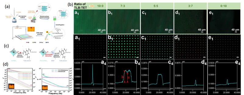 电流体(EHD)喷墨打印高分辨率钙钛矿量子点(PeQDs)阵列在微型显示领域具有广阔的应用前景。通常,EHD喷墨打印的墨水需要极性体系,但它很容易猝灭PeQDs。同时,溶剂参数的不匹配还会导致打印阵列表面形貌不均匀以及印刷不稳定。