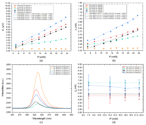 图2 (a) 样品1-5的VT-P曲线;(b) 样品1-5的 IT-P 曲线;(c) 样品1-5的PL谱以及(d)样品1、3、4、5的反向饱和电流。