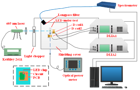 该研究工作提出了一种基于光生伏特效应和电磁耦合理论的非接触方法来测量Mini-LED的光电特性,其中包括I-V特性、反向饱和电流和增强KGD检测。开发并搭建一体化非接触检测Mini-LED光电特性的测试系统。系统采用405 nm激光器激发Mini-LED产生光生电流,通过正交微型线圈获取感应信号,并送入数字锁相放大器进行信号提取,然后实现目标参数的测量。所提方法可以有效地解决由于键合线断裂或芯片虚焊而导致的KGD检测失效等问题,具有在大规模微型LED生产中应用部署的潜力。