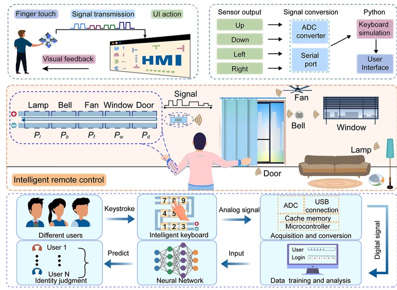 为了解决现有硬质电子器件的局限性并促进人体增强领域的发展,研究团队发展了一种智能的、可编辑的织物型触摸传感器(IP织物传感器),可赋予人类与外界互动的能力。该IP织物传感器的传感结构是利用导电织物并联成平面内的电双边结构,可以实现了将触摸信号转换为电信号,这使IP织物传感器不仅能够检测是否衣物有被触摸而且能准确识别触摸位置。该IP织物传感器采用了单层结构的设计,具有可重构性,这允许IP织物传感器可以被定制成不同的形状。此外,这种单层导电织物的设计避免了IP织物传感器在被佩戴时,即使因变形也不会产生错误的电信号,确保了在没有触摸的情况下,不会有指令发送。最后,研究团队结合人工智能、物联网技术和编程技术,设计IP织物传感器以完成闭环互动娱乐系统、智能家居系统、用户身份验证系统的验证。这些验证显示了该IP织物传感器的多功能性及其在推进人体增强交互式系统中的潜力。
