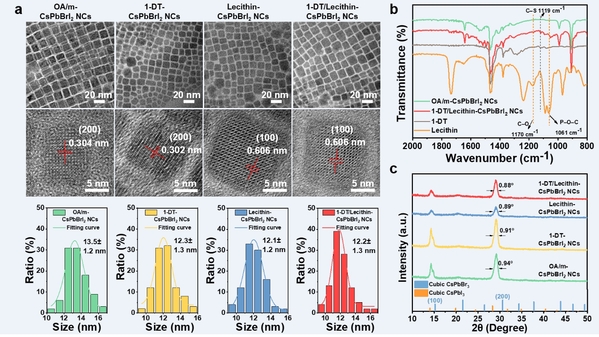 Figure 2. (a) TEM, HRTEM images and particle size distribution statistic graphs. (b) FTIR spectra, (c) XRD pattern of OA/m-CsPbBrI2 NCs, 1-DT-CsPbBrI2 NCs, Lecithin-CsPbBrI2 NCs and 1-DT/Lecithin-CsPbBrI2 NCs.