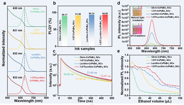 Figure 3. (a) UV-vis absorption spectra and PL spectra, (b) PLQY, and (c) Time-resolved PL decay curves of OA/m-CsPbBrI2 NCs ink, 1-DT-CsPbBrI2 NCs ink, Lecithin-CsPbBrI2 NCs ink and 1-DT/Lecithin-CsPbBrI2 NCs ink. (d) PL spectra of OA/m-CsPbBrI2 NCs ink, 1-DT-CsPbBrI2 NCs ink, Lecithin-CsPbBrI2 NCs ink and 1-DT/Lecithin-CsPbBrI2 NCs ink diluted solution after 2 h in ambient conditions. (Inset: The images of four samples under natural light and UV illumination) (e) Normalized PL intensity of OA/m-CsPbBrI2 NCs ink, 1-DT-CsPbBrI2 NCs ink, Lecithin-CsPbBrI2 NCs ink and 1-DT/Lecithin-CsPbBrI2 NCs ink after adding different volumes of ethanol.