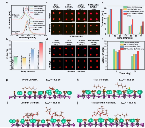 Figure 4. (a) PL spectra of EHD inkjet printed arrays and spin-coated films prepared from OA/m-CsPbBrI2 NCs ink, 1-DT-CsPbBrI2 NCs ink, Lecithin-CsPbBrI2 NCs ink and 1-DT/Lecithin-CsPbBrI2 NCs ink. (b) PLQY of OA/m-CsPbBrI2 array, 1-DT-CsPbBrI2 array, Lecithin-CsPbBrI2 array and 1-DT/Lecithin-CsPbBrI2 array. (c) The morphology and (e) diameter changes of EHD printed OA/m-CsPbBrI2 array, 1-DT-CsPbBrI2 array, Lecithin-CsPbBrI2 array and 1-DT/Lecithin-CsPbBrI2 array during continuous UV illumination for 60 minutes. (d) The morphology and (f) diameter changes of EHD printed OA/m-CsPbBrI2 array, 1-DT-CsPbBrI2 array, Lecithin-CsPbBrI2 array and 1-DT/Lecithin-CsPbBrI2 array before and after 30 days under ambient conditions (the scale bar in (c) and (d) is 25 μm).The adsorption energy of (g) OA/m, (h) 1-DT, (i) lecithin, (j)1-DT and lecithin on the surface of CsPbBrI2 NCs.