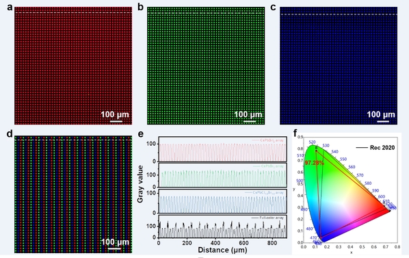 Figure 5. Array printing demonstration of (a) 1-DT/Lecithin-CsPbBrI2 NCs array, (b) CsPbBr3 NCs array, (c) CsPbCl1.5Br1.5 NCs array and (d) tri-color PeNCs arrays on black photoresist template. (e) Gray value and (f) color gamut of as-printed arrays.