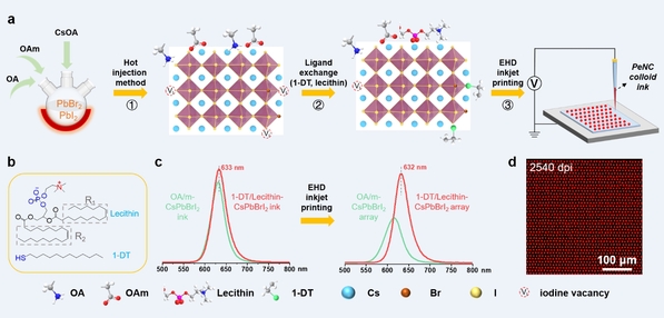 Figure 1. (a) Schematic diagram of preparation of red PeNCs ink by ligand exchange and EHD inkjet printing process. (b) Chemical structural formula of ligands. (c) PL spectra of ink and printed arrays before and after passivation of dual ligands. (d) Demonstration of high-resolution dot array printed by EHD inkjet printing, with spatial resolution of 2540 dpi and dot diameter of 5 μm.