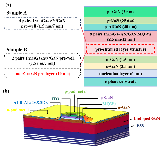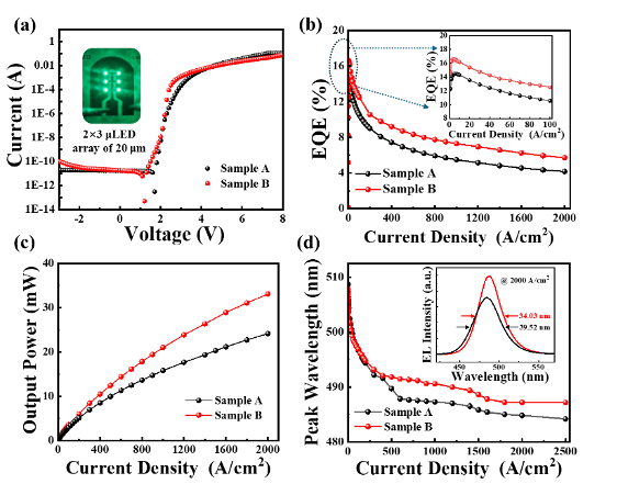 微型发光二极管(Micro-LEDs)凭借其优异的响应速度、低功耗、高通信带宽和高效率等特性,已成为可见光通信(VLC)领域中极具发展前景的光源。然而,绿光氮化镓基Micro-LEDs在实际应用中仍面临关键挑战,即如何实现高质量、低应力的多量子阱结构。针对这一问题,本研究创新性地提出了一种外延结构,该结构包含了1对铟含量为15%的前置层和2对铟含量为5%的前置阱来进行应力调制。基于此外延结构,研究团队成功制备了直径为20 μm的2×3绿光Micro-LEDs器件阵列。本研究的核心目标是通过优化器件外延结构,有效降低晶体内部应力,抑制量子限制斯塔克效应(QCSE),从而显著提升器件的可见光通信性能。以下是本次研究相关数据图展示,其中样品A是仅有前置阱而无前置层的传统外延结构,而样品B是本研究提出的同时具有前置阱和前置层的新型外延结构。
