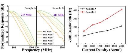 实验结果显示前置层的引入提高了该结构底层的横向晶格常数,减轻了晶格失配导致的应变积累,减缓了QCSE现象,提高了晶体质量,产生了更好的光电性能和通信性能。在应力调制下,该绿光Micro-LEDs阵列(样品B)的外量子效率(EQE)可达16.6%,-3 dB调制带宽可达411 MHz,分别比具有传统外延结构的样品A高出14.8%和91.2%。