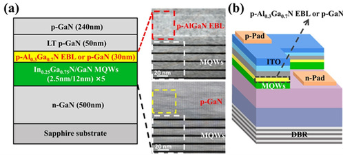 图1 (a) 有和没有 EBLµ-LED外延结构示意图和TEM图, (b) µ- LED结构。