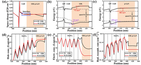 图3 (a)模拟空间电荷分布, (b)和(c)能带图, (d)和(e)空穴和电子浓度, (f) 有和没有EBLµ-LED的辐射复合率。