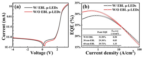 图2 有和没有EBLµ- led的(a) I-V和(b) EQE特性。