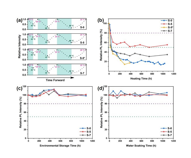 本研究通过改进高温固相法、ZnI2作助熔剂和改变前驱体的含量,成功在坚固SiO2包覆的CsPbI3中引入结构稳定的零维钙钛矿量子点Cs4PbI6。SiO2保护层有效隔绝了氧气和水分子侵入钙钛矿量子点,阻止CsPbI3的相变。在80℃长期(>1000h)热环境以及热循环实验的结果表明,引入Cs4PbI6将钝化CsPbI3表面,抑制发光中心的缺陷密度,提高了辐射复合过程的占比,使得样品表现出更高的光转换效率和极强的热稳定性。