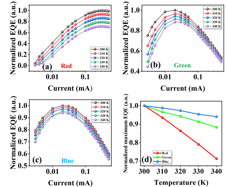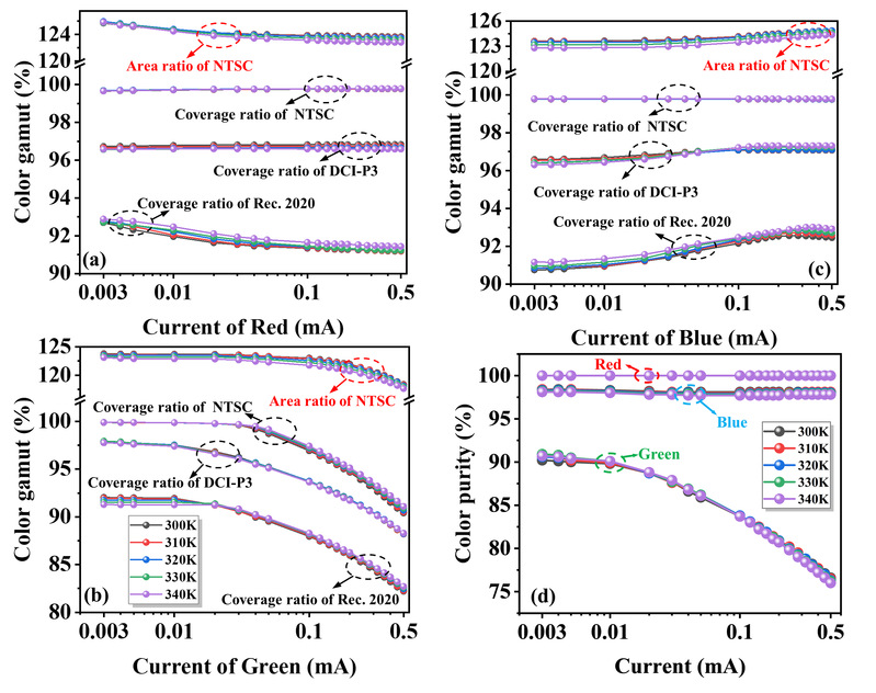 该研究以mesa尺寸为10 μm的AlGaInP红光Micro-LED、InGaN蓝光和绿光Micro-LED为研究对象。分别研究了电流、温度对RGB Micro-LED光电性能的调控机制,进一步研究了RGB Micro-LED全彩化显示的性能调控机制。在研究中发现,红光Micro-LED的最大EQE受温度的影响最严重,绿色Micro-LED的工作电流对RGB三基色Micro-LED全彩化显示的色域有决定性影响。