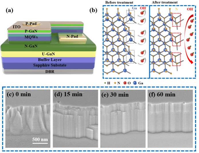 图 1:(a)μ-LED结构示意图,(b)TMAH蚀刻原理示意图,(c-f)侧壁表面的扫描电子显微镜(SEM)图像