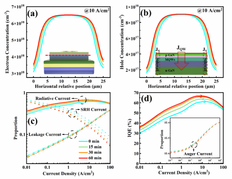 为明确带宽提升的物理本质,团队基于TCAD软件构建侧壁缺陷模型,量化分析不同处理时长下的载流子行为与电流分配规律,仿真结果与实验数据高度吻合:如图2模拟显示,60分钟处理后量子阱区域电子浓度提升,空穴浓度同步增加,这是因为侧壁缺陷减少降低了表面漏电流,使更多电流注入量子阱,为高频响应提供载流子基础。