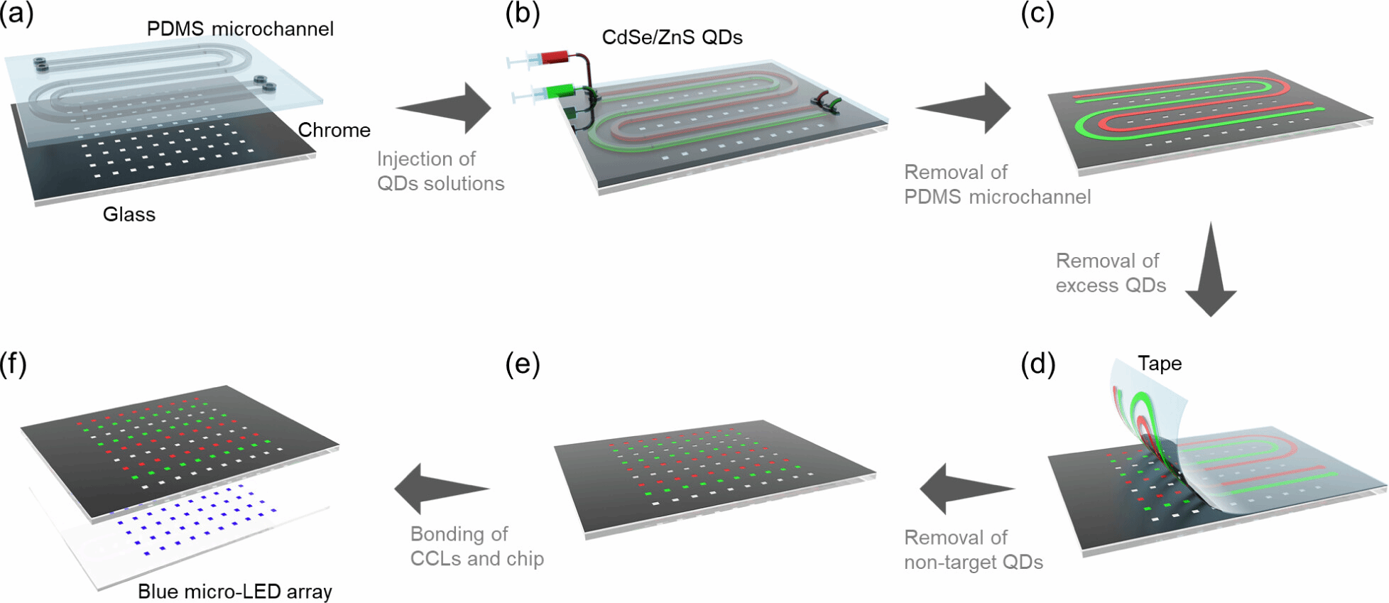 Figure 1. Schematic illustration of the preparation of QD CCLs by PDMS–glass microfluidic device. (a) Bonding of PDMS microchannel with a selectively chromium-deposited and microhole-arrayed glass substrate. (b) Injection of red and green QD solutions. (c) Deposited QD patterns after peeling off the PDMS microchannel. (d) Removal of excess QDs by tape. (e) Separately deposited red and green QD CCLs. (f) Bonding of CCLs with a blue micro-LED chip for constructing a micro-LED full-color display device.