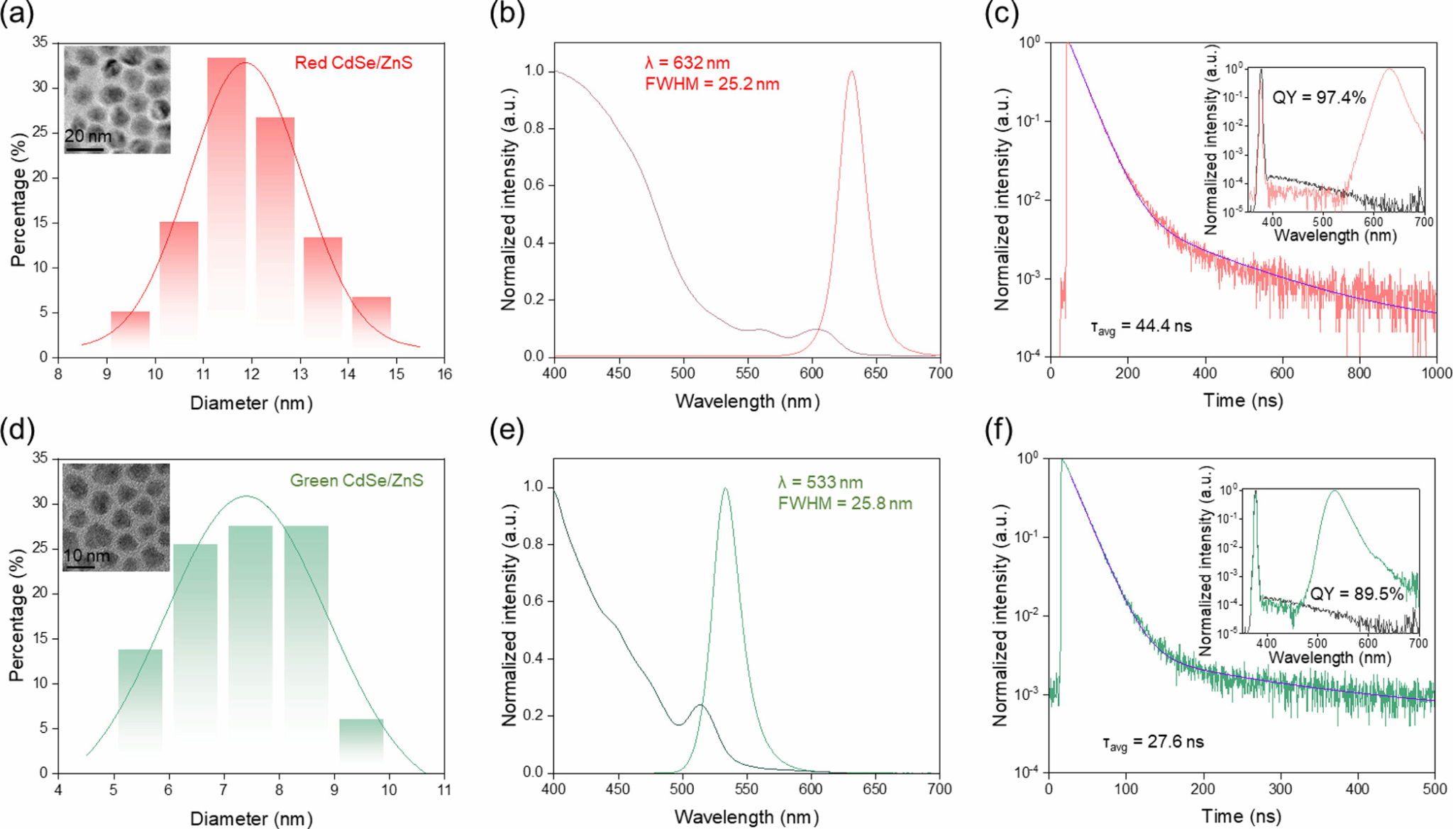 Figure 2. TEM and size distribution of (a) red and (d) green CdSe/ZnS QDs. Absorption and PL spectra of (b) red and (e) green CdSe/ZnS QD solutions. PLQY and TRPL decay curves of (c) red and (f) green CdSe/ZnS QD solutions.