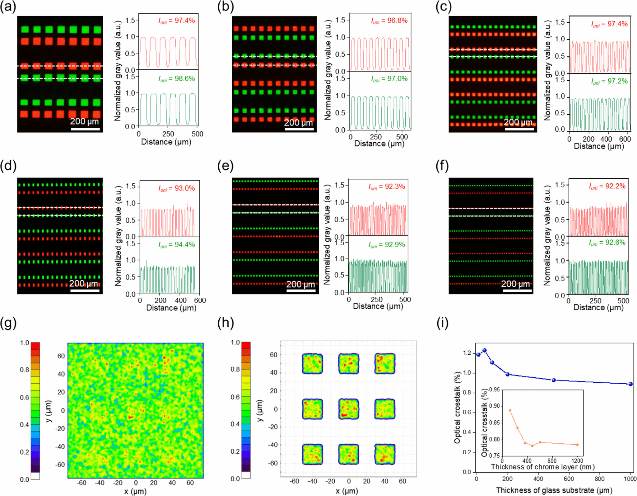 Figure 3. Fluorescence images and fluorescence intensity distributions of red and green two-color CCLs with subpixel sizes of (a) 50 μm × 50 μm, (b) 30 μm × 30 μm, (c) 20 μm × 20 μm, (d) 20 μm × 10 μm, (e) 8 μm × 8 μm, and (f) 5 μm × 5 μm. Irradiance maps of the full-color micro-LED device (g) without and (h) with a patterned chrome layer using TracePro simulation software. (i) Relation between the optical crosstalk rate and the thickness of the glass substrate and chrome layer.