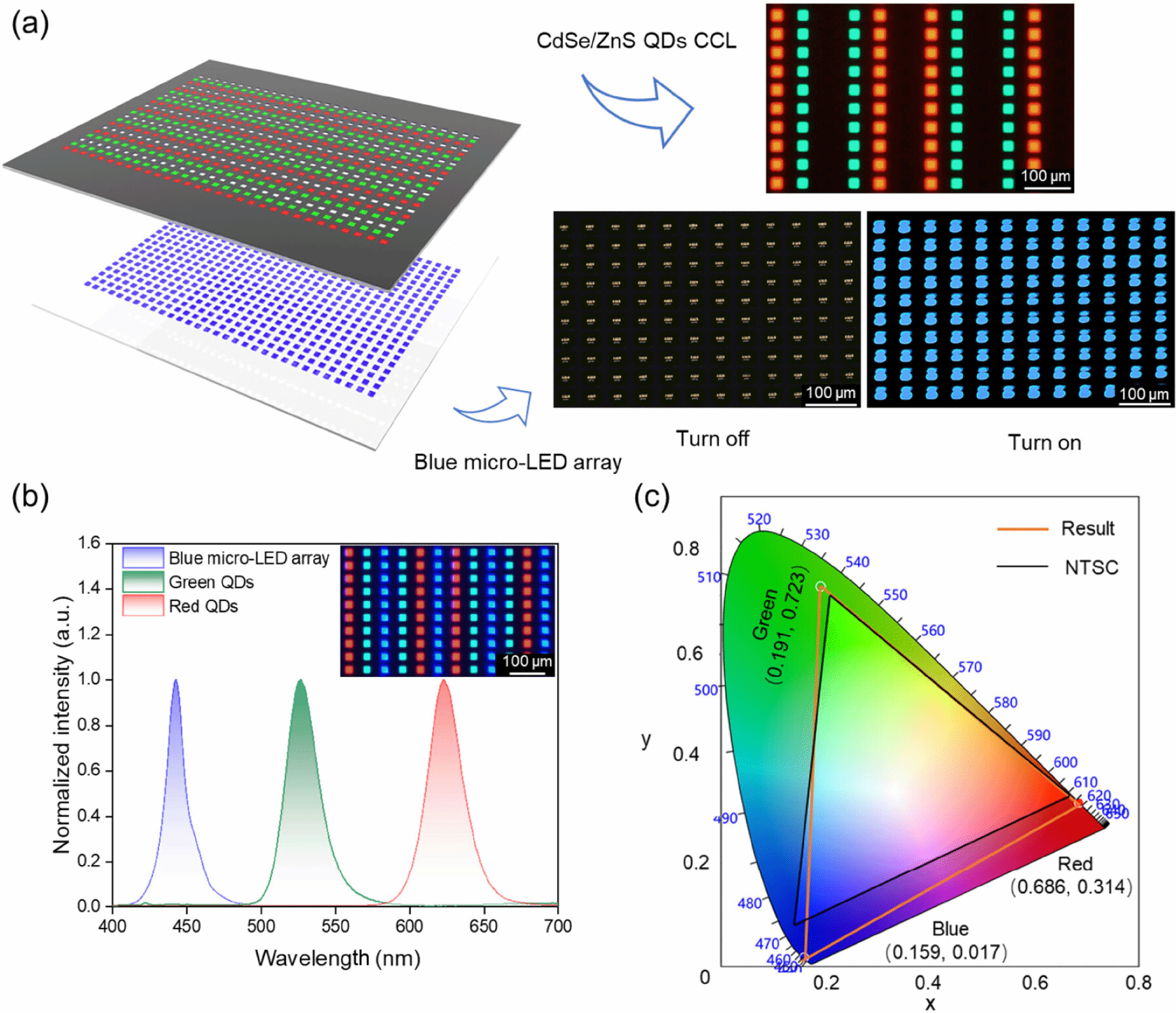 Figure 5. (a) Schematic illustration of the full-color micro-LED display device prototype and microscopy images of the blue micro-LED chip and red and green QD CCLs. (b) EL spectrum of blue micro-LED chip and PL spectra of red and green QD CCLs. The inset shows the microscopic image of the color conversion full-color micro-LED device prototype in the turned-on state. (c) Color gamut of the color conversion-based micro-LED full-color display device.