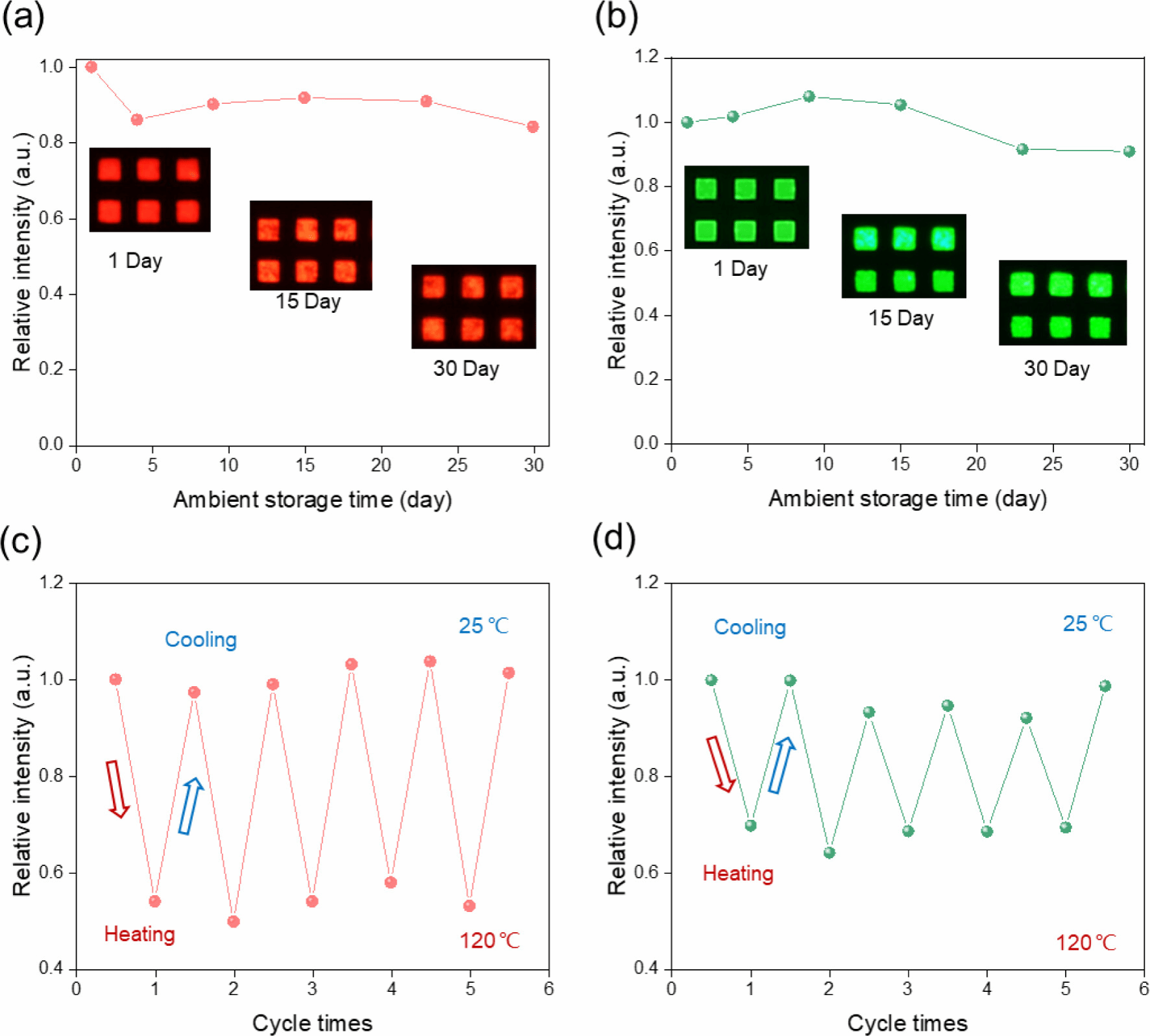 Figure 4. Temporal evolution of the PL intensity of (a) red and (b) green CdSe/ZnS arrays during ambient storage (25 °C and 70% room humidity). The insets comprise fluorescent photographs of the CCLs on the respective days: day 1, day 15, and day 30. The change in relative PL intensity of (c) red and (d) green CdSe/ZnS arrays upon five heat–cool cycles between 25 and 120 °C.
