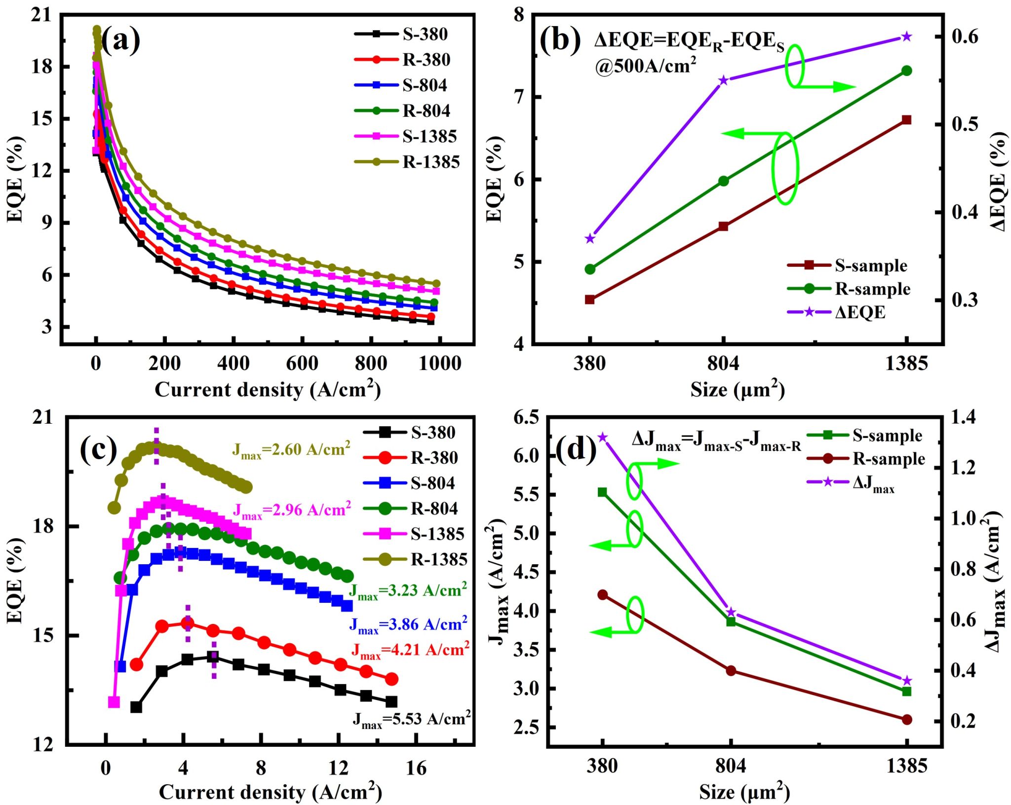 Fig. 4. (a) EQE as a function of current density; (b) EQE as a function of chip size at 500 A/cm2; (c) The variation curve of EQE within the current density range of 0.5–15 A/cm2; (d) The dependence of Jmax on device size.