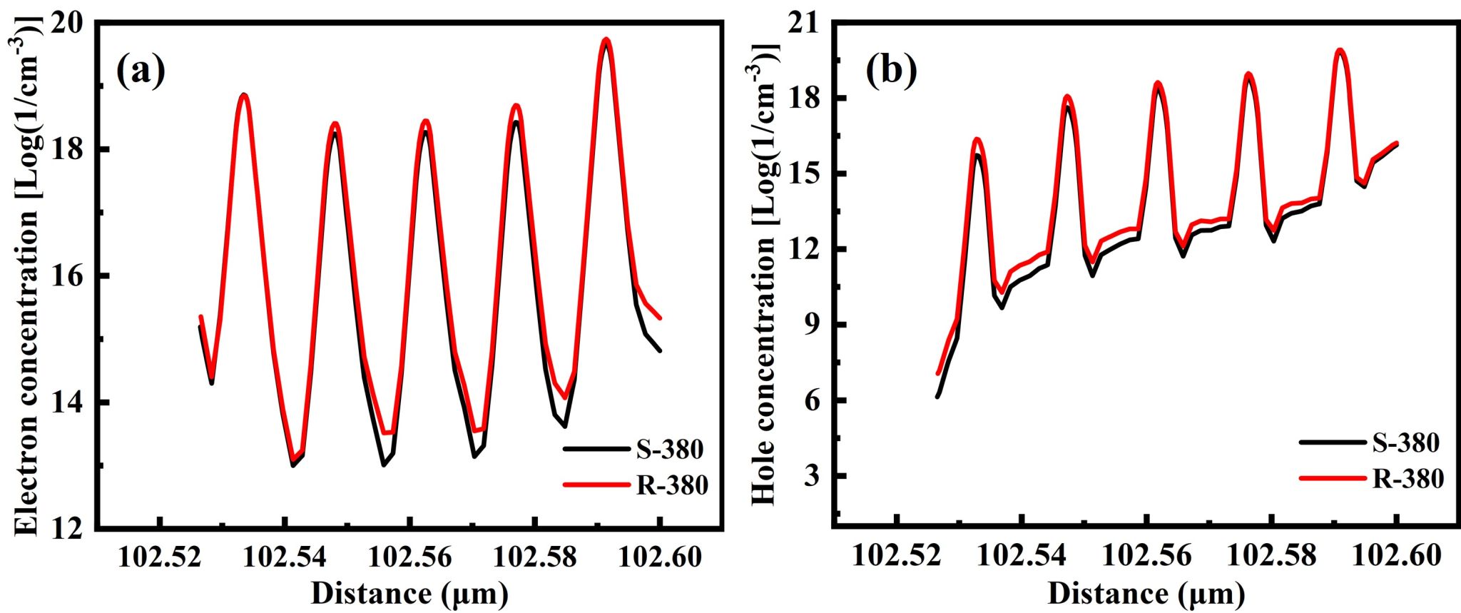 Fig. 5. The carrier distribution in the active region of 380 μm2 devices: (a) Electron concentration distribution; (b) Hole concentration distribution.