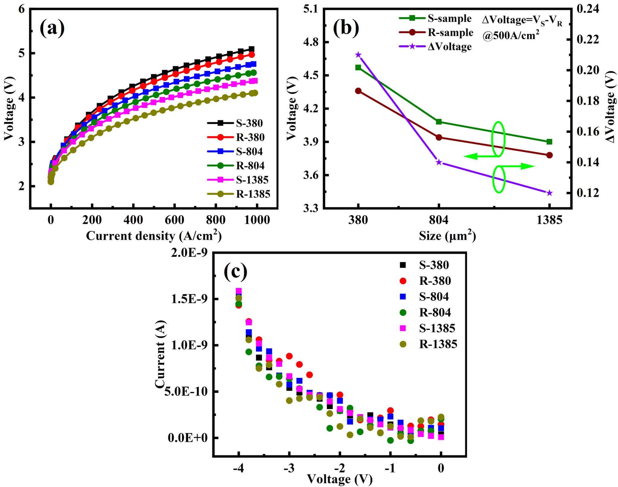 Fig. 3. (a) Characteristics of voltage versus current density;(b) Voltage versus chip size at 500 A/cm2;(c) Reverse leakage current characteristics in the bias range of −4 V to 0 V.