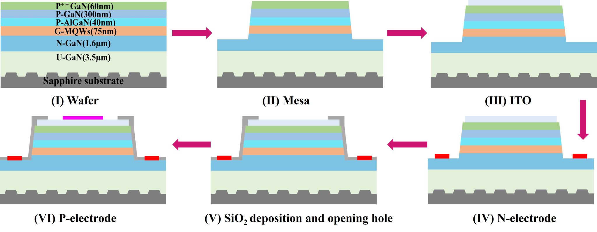 针对这一问题,研究团队系统研究了台面几何结构对InGaN/GaN基绿色Micro-LED光电与热学性能的影响。研究人员设计并制备了具有相同发光面积但不同台面形状的多尺寸Micro-LED芯片,并结合实验测试与多物理场仿真,对其电流分布、光提取效率(LEE)、非辐射复合行为及热管理性能进行了深入分析。