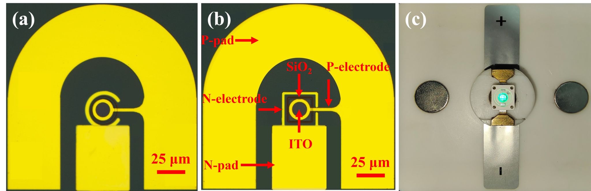 Fig. 2. Optical microscope images of 380 μm2 micro-LED: (a) Round mesa device; (b) Square mesa device; (c) Image of the packaged device and its electroluminescence.