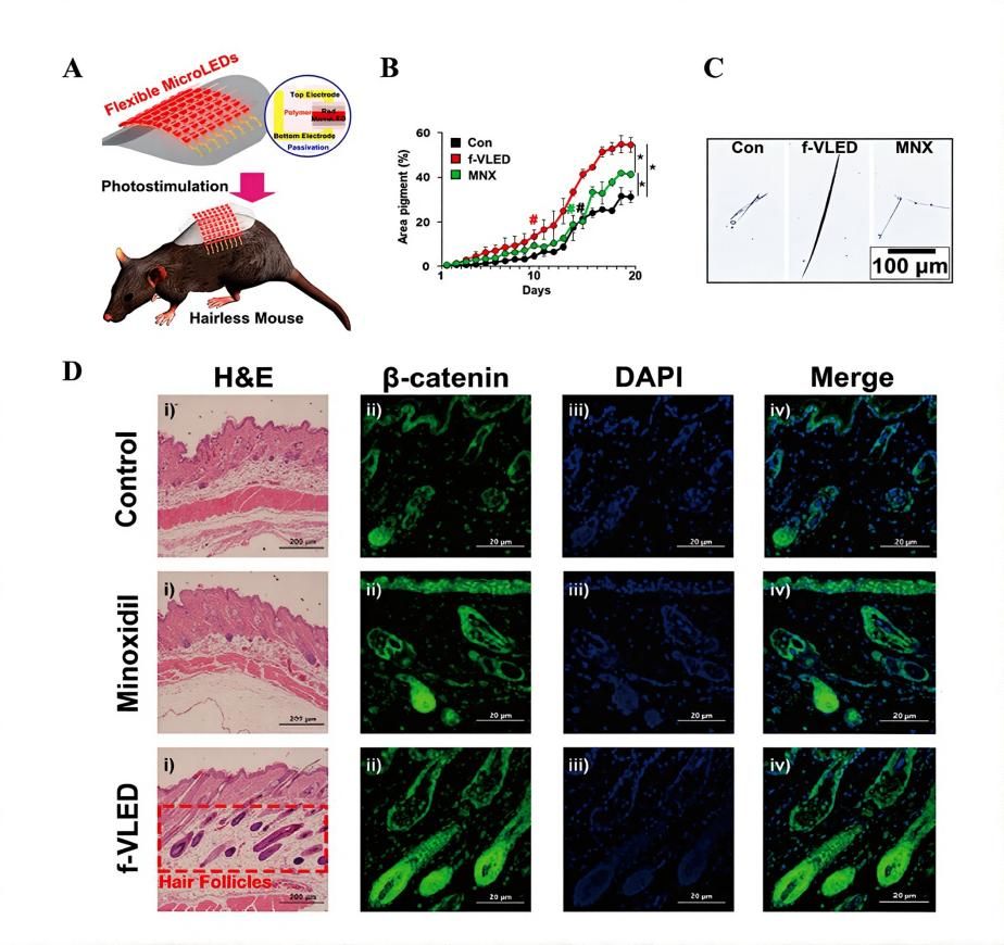 在皮肤与毛发再生方面,Lee等人开发了柔性垂直结构微型LED贴片,发射650nm红光穿透皮肤2mm刺激毛囊,通过激活Wnt/β-catenin信号通路促进毛发再生,效果优于米诺地尔对照组。
