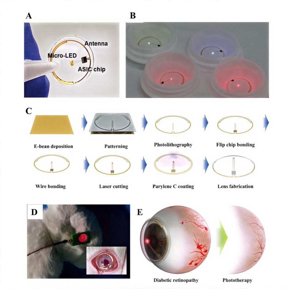 在眼科领域,Lee团队开发了智能LED隐形眼镜,集成远红光/近红外微型LED,通过无线供电实现对糖尿病视网膜病变的非侵入性治疗,在兔模型中显著降低视网膜血管高渗透性。