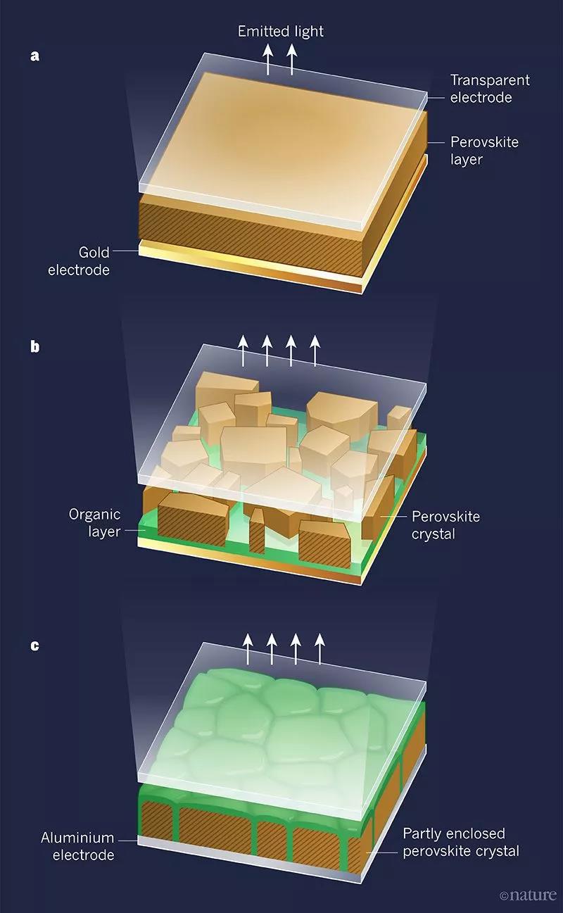 此后,钙钛矿发光二极管便吸引了越来越多的关注。然而,目前报导的绿光和近红外光钙钛矿LED的最高外量子效率分别为14%和12%,且钙钛矿发光二极管器件稳定性差,远低于已经商业化的有机发光二极管(OLEDs)和无机量子点发光二极管(QLEDs)等。