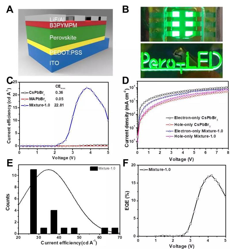 (A)钙钛矿LED器件的结构示意图,(B)钙钛矿LED器件的实物图、(C)三种钙钛矿LED器件的性能对比、(D)单层CSPbBr3和准核-壳结构的钙钛矿薄膜对应的纯电子、纯空穴器件性能分析、(E)准核-壳结构的钙钛矿薄膜LED的性能统计数据和(F)最优LED器件性能数据