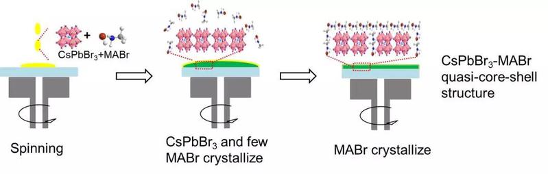 钙钛矿层的成膜机制如下:将混合钙钛矿溶液滴加在玻璃基板上并开始旋涂,随着旋涂过程中溶剂的挥发和反溶剂甲苯的滴加,体系溶解度急剧下降,CsPbBr3由于在DMSO中的溶解度低而首先形核并快速长大,而MABr由于溶解度较大,后结晶析出,残留有少量MABr在CsPbBr3晶界和表面上,最终得到具有CsPbBr3-MABr准核-壳结构钙钛矿薄膜。