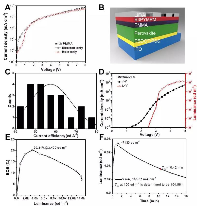 (A)有无PMMA层的钙钛矿薄膜纯电子、纯空穴器件性能比较、(B)插入PMMA层后的LED器件结构示意图、(C)性能统计分析数据、(D)最优的LED器件的电流-亮度-电压曲线、(E)最优LED器件的EQE-L曲线和(F)LED器件工作寿命测试