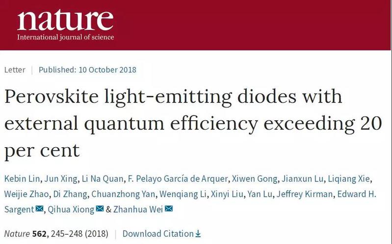 Kebin Lin, Edward H. Sargent, Qihua Xiong,Zhanhua Wei et al. Perovskite light-emitting diodes with external quantumefficiency exceeding 20 per cent. Nature 2018, 562, 245–248.