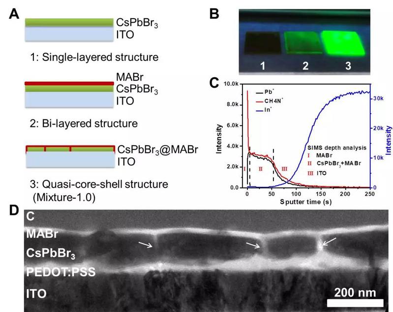 研究人员设计了不同组分分布的钙钛矿薄膜:单层 CsPbBr3、叠层CsPbBr3/MABr和CsPbBr3@MABr准核-壳结构,通过对比不同组分分布的钙钛矿薄膜在紫外灯下的荧光(PL)可以明显看出,具有准核-壳结构的钙钛矿薄膜表面平整且具有较高的PL。研究人员通过二次离子质谱 (SIMS)深度组分分析和薄膜TEM截面分析进一步验证了CsPbBr3@MABr准核-壳结构。